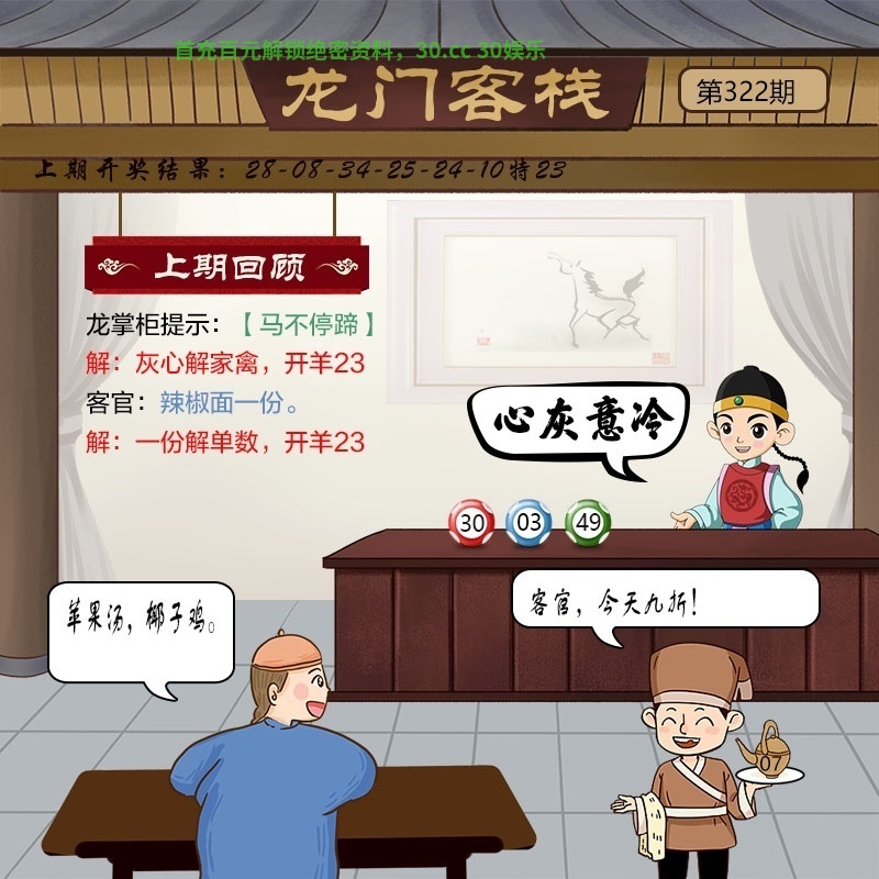 第322期掌柜:心灰意冷 解:形容灰心丧气、意志消沉的状态 小二:客官,今天九折 解:无 客官:苹果汤,椰子鸡 解:椰子鸡解家禽的生肖牛、马、羊、鸡、狗、猪 推荐九肖:牛虎猴猪兔马羊狗鸡 |
